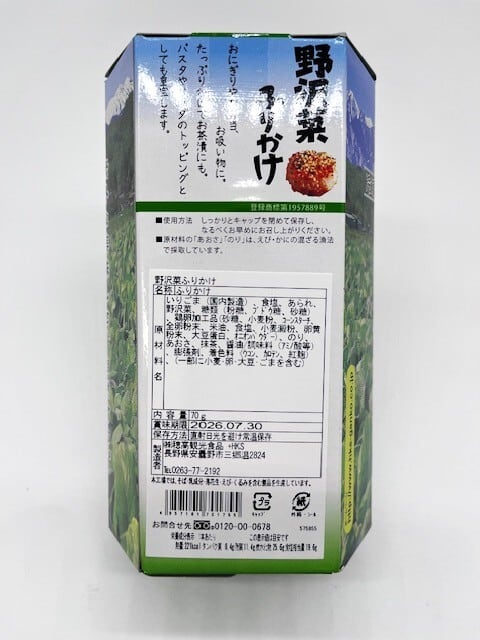【原材料名】いりごま、(国内製造)、食塩、あられ、野沢菜、糖類(粉糖、ブドウ糖、砂糖)鶏卵加工品(砂糖、小麦粉、コーンスターチ、全卵粉末、米油、食塩、小麦澱粉、卵黄粉末、大豆蛋白、オニオンパウダー、)のり、あおさ、抹茶、醤油/調味料(アミノ酸等)、膨張剤、着色料、(ウコン、カロテン、紅麹)(一部に小麦・卵・大豆・ごまを含む)