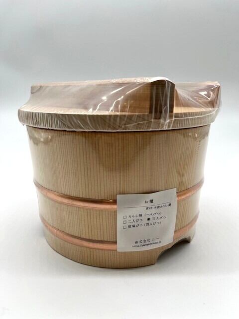 三人櫃しゃもじ付は、長野県木曽産の高品質な「木曽さわら」(椹)を使い、炊きたてのご飯をより美味しく、ふっくらと仕上げるための伝統的な木製調理道具です。お櫃に移すことで、ご飯の余分な水分が吸収され、旨みや甘みが凝縮され、木の香りが風味を増します。しゃもじもついた定番の大きさです。